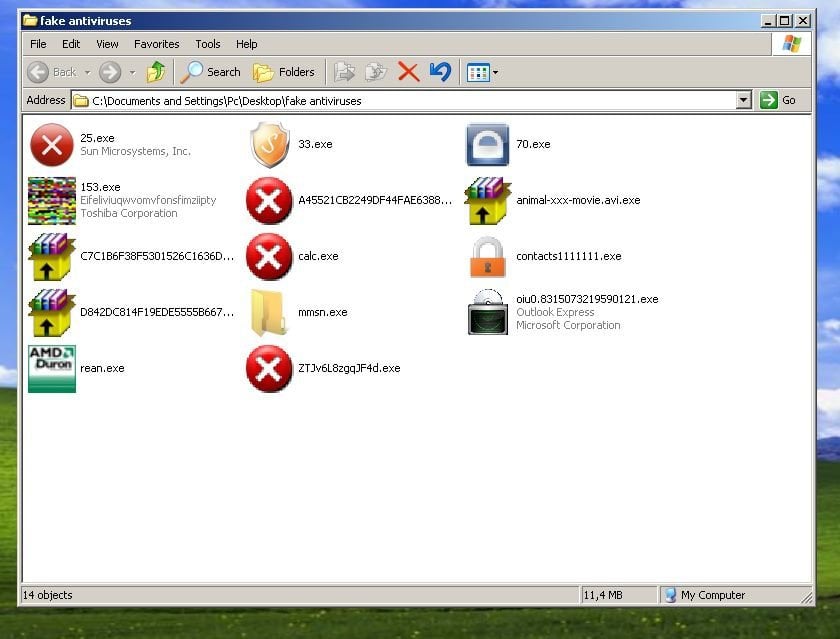 After spending some time searching for various fake antivirus samples, I selected 14 participants. These were fake antivirus programs that scare users into buying full versions by displaying bogus warnings and errors. Some were old versions, some more recent.