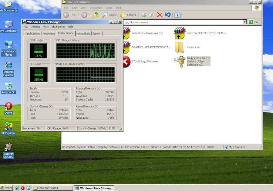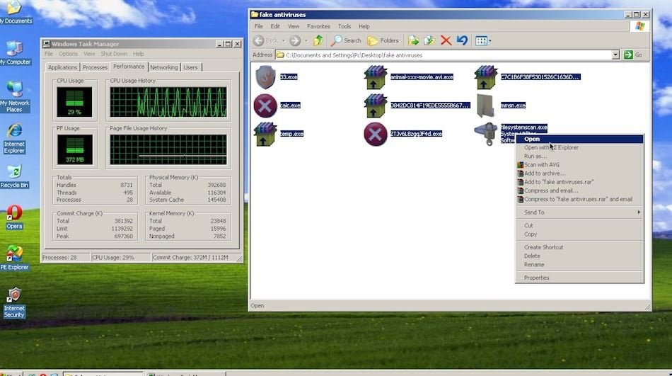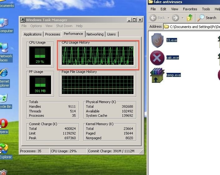When the fake antivirus samples were executed, Task Manager was closed immediately, leaving no possibility to monitor CPU and memory load fluctuations. The hard drive noise was terrible, and the mouse cursor was virtually impossible to move; not surprising, then, that the CPU load average was near 100 percent.