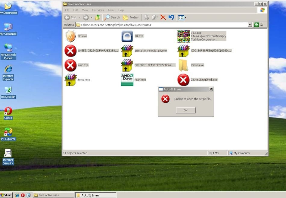 After about a minute, the first error appeared: "Unable to open the script file." Fake antivirus samples started to disappear one by one.