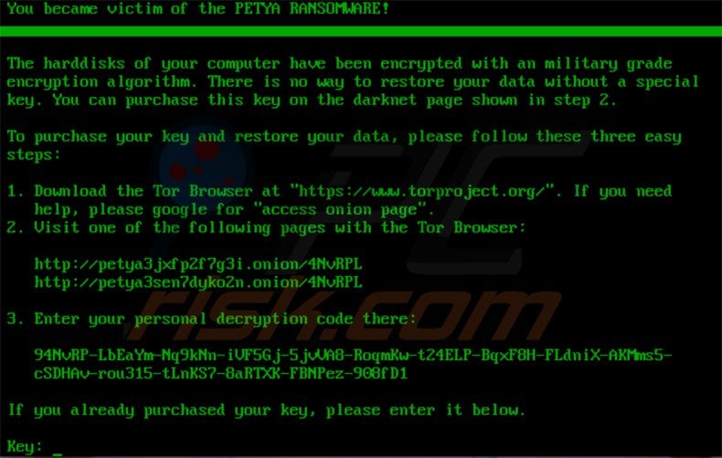 By encrypting hard drive portions, Petya prevents users from booting their operating systems. The ransomware replaces the Master Boot Record (information placed at the beginning of hard drive instructs the computer how to boot) with a malicious loader. Petya then automatically restarts the computer. Once the computer is rebooted, the new (malicious) loader will execute and begin encrypting files. During this process, a fake check disk (CHKDSK) screen is shown. The ransomware corrupts the Master File Table (MFT). Therefore, the computer is unable to reference the location of files on the system (if there are any). Files become inaccessible, and therefore, Windows can no longer load. An image of a skull is then displayed, which changes to a lock screen containing a message claiming that the files have been encrypted and the victim must pay a ransom to restore them. The screen encourages users to download the Tor browser and visit URLs provided that supposedly contain further payment instructions. Research shows that there is no way to restore the files without payment. You can repair your MBR, and although this will remove the lock screen, it will not decrypt the files - it will only provide an opportunity to format the hard drive and install a new copy of Windows. Again, at time of research, there were no tools capable of decrypting the Master Boot Record to make files accessible.