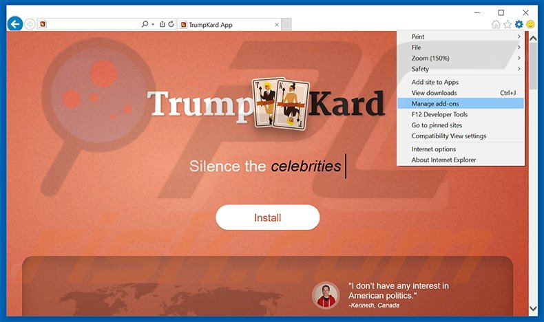 (at the top right corner of Internet Explorer), select "Manage Add-ons". Look for "TrumpKard", select this entry and click "Remove".