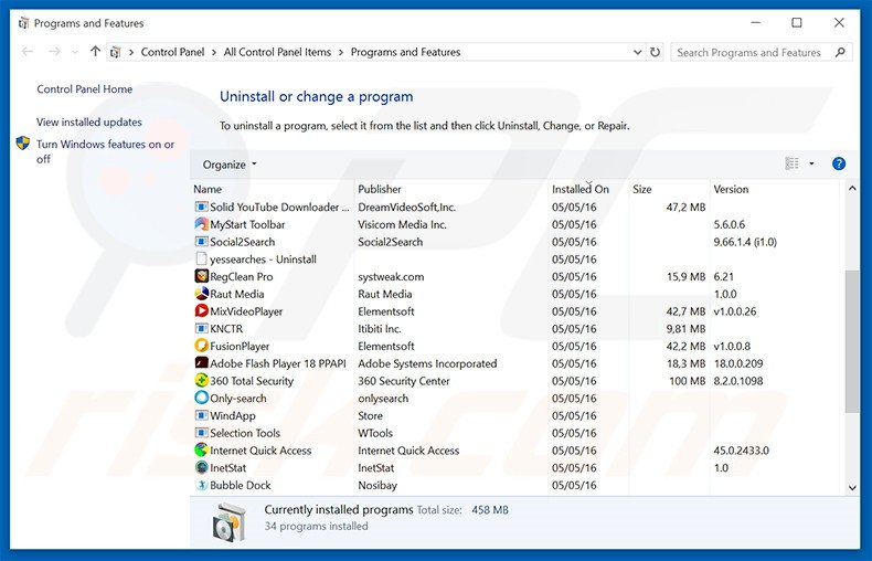 In the uninstall programs window: look for any recently-installed potentially unwanted applications, select these entries and click "Uninstall" or "Remove".
