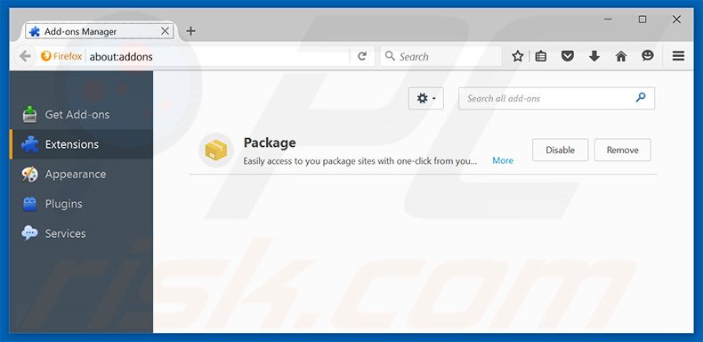 (at the top right corner of the main window), select "Add-ons". Click on "Extensions" and remove "Package", and other recently-installed browser plug-ins.