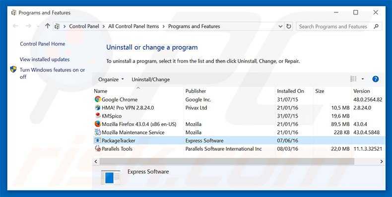 In the uninstall programs window: look for any recently-installed suspicious applications (for example, "PackageTracker"), select these entries and click "Uninstall" or "Remove".