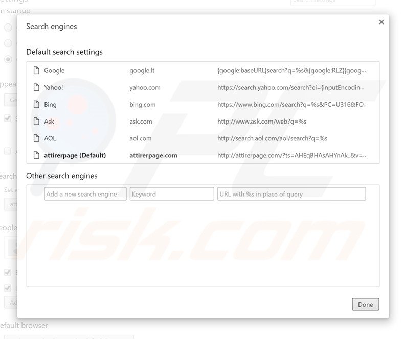 (at the top right corner of Google Chrome), select "Settings", in "Search" section, click "Manage Search Engines...", remove "attirerpage.com" and add or select your preferred Internet search engine.