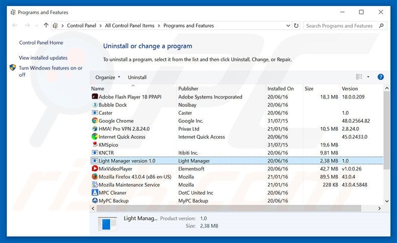 In the uninstall programs window, look for "Light Manager version 1.0", select this entry and click "Uninstall" or "Remove".