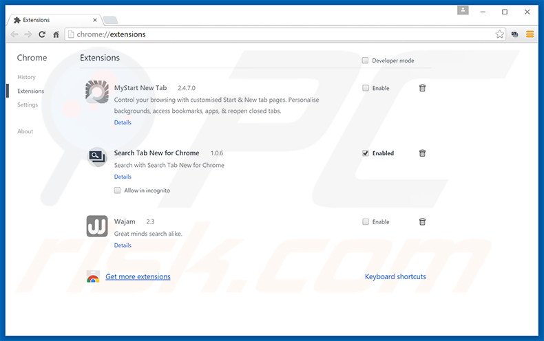 (at the top right corner of Google Chrome), select "Tools" and click "Extensions". Locate all recently-installed suspicious add-ons (for example, "Search Tab New for Chrome"), select these entries and click the trash can icon.