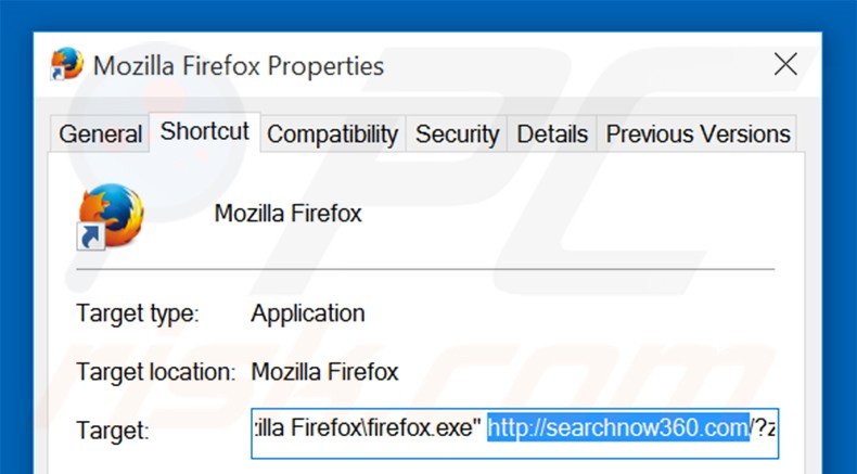 This browser hijacker changes the "Target" field of the Mozilla Firefox shortcut. To fix this, locate the shortcut on your Desktop and click the right mouse button over it. In the opened menu, choose "Properties". In the opened window, locate the Target field and eliminate all text (hxxp://www.searchnow360.com/...), which is entered after "C:\Program Files\Mozilla Firefox\firefox.exe"