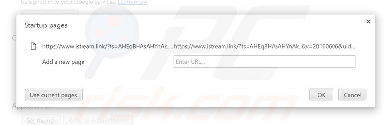 (at the top right corner of Google Chrome), select "Settings". In the "On startup" section, click "set pages", hover your mouse over hxxp://www.istream.link and click the x symbol. Now, you can add your preferred website as your homepage.