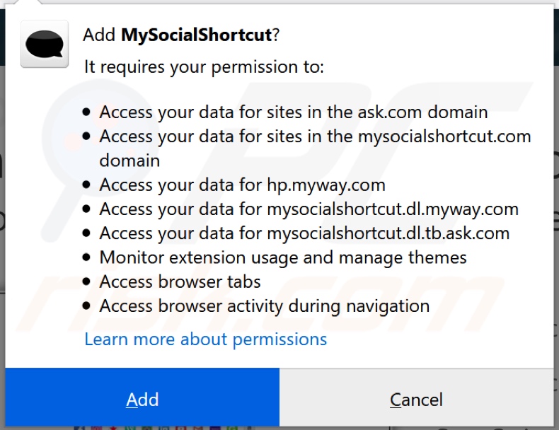 MySocialShortcut browser hijacker asking for various permissions on Mozilla Firefox: