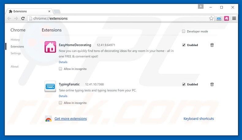 (at the top right corner of Google Chrome), select "Tools" and click "Extensions". Locate "EasyHomeDecorating", and other recently-installed suspicious add-ons, select these entries and click the trash can icon.