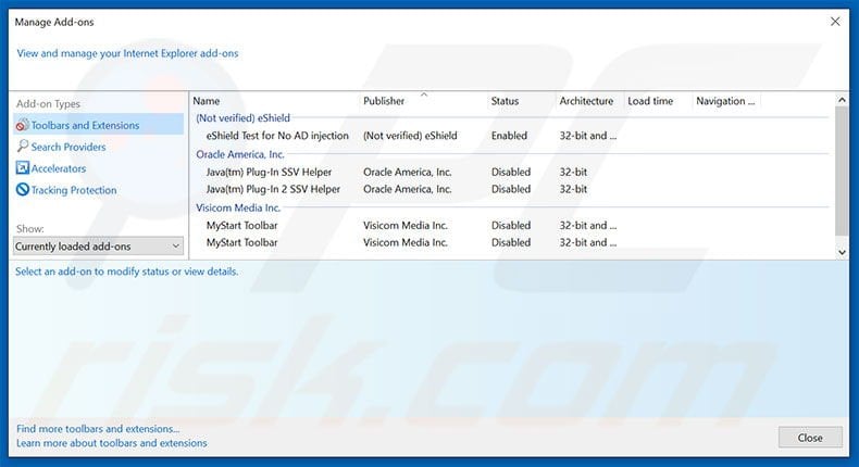 (at the top right corner of Internet Explorer), select "Manage Add-ons". Look for any recently-installed suspicious browser extensions, select these entries and click "Remove".