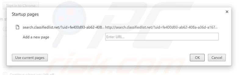 (at the top right corner of Google Chrome), select "Settings". In the "On startup" section, click "set pages", hover your mouse over hxxp://search.classifiedlist.net and click the x symbol. Now, you can add your preferred website as your homepage.