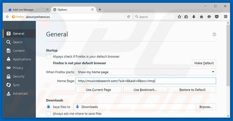 (at the top right corner of the main window), then select "Options", in the opened window, remove hxxp://musictabsearch.com and enter your preferred domain, which will open each time you start Mozilla Firefox.