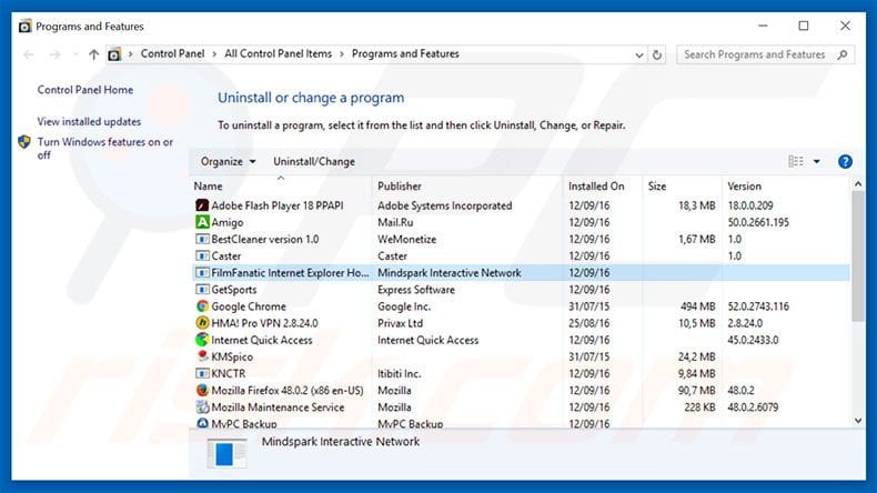 In the uninstall programs window: look for any recently-installed suspicious applications (for example, "FilmFanatic Internet Explorer..."), select these entries and click "Uninstall" or "Remove".