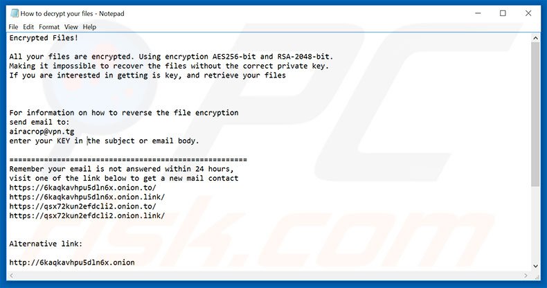 The message informs victims of the encryption and encourages them to contact AiraCrop's developers via an email address provided (airacrop@vpn.tg). Victims will then be provided with further instructions. As mentioned, AiraCrop uses asymmetric cryptography and, therefore, public (encryption) and private (decryption) keys are generated.