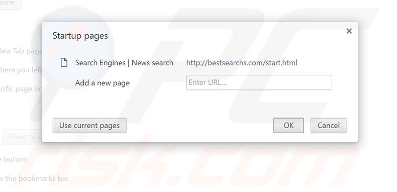 (at the top right corner of Google Chrome), select "Settings". In the "On startup" section, click "set pages", hover your mouse over hxxp://www.bestsearchs.com/start.html and click the x symbol. Now, you can add your preferred website as your homepage.