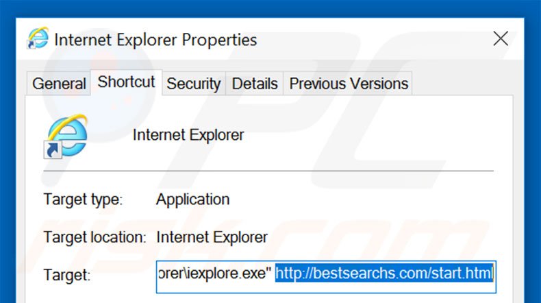 This browser hijacker changes the "Target" field of the Internet Explorer shortcut. To fix this, locate the shortcut on your Desktop and click the right mouse button over it. In the opened menu, choose "Properties". In the opened window, locate the Target field and eliminate text (hxxp://www.bestsearchs.com/start.html...), which is entered after "C:\Program Files\Internet Explorer\iexplore.exe".