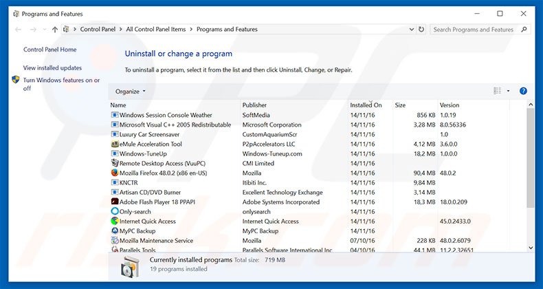 In the uninstall programs window: look for any recently-installed potentially unwanted applications, select these entries and click "Uninstall" or "Remove".