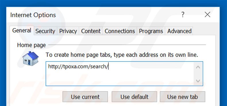(at the top right corner of Internet Explorer), select "Internet Options", in the opened window, remove hxxp://www.tpoxa.com and enter your preferred domain, which will open each time you launch Internet Explorer.