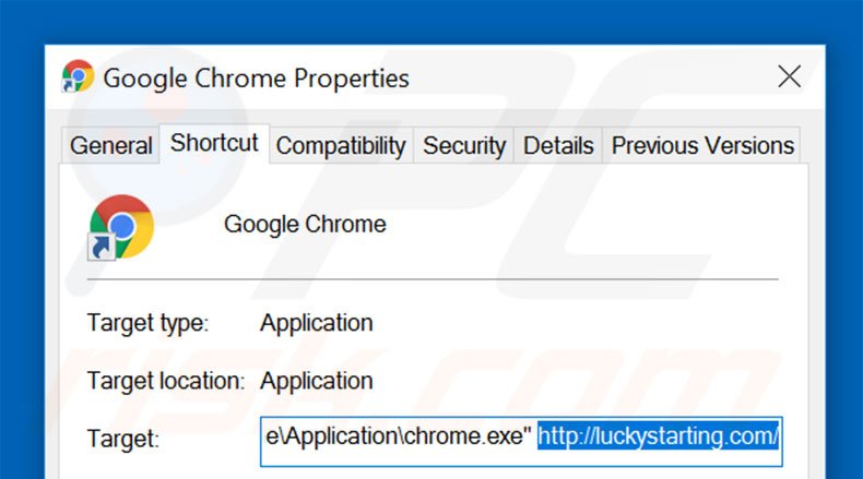 This browser hijacker modifies the "Target" field of the Google Chrome shortcut. To fix this, locate the shortcut on your Desktop and click the right mouse button over it. In the opened menu, choose "Properties". In the opened window, locate the Target field and eliminate all text (hxxp://www.luckystarting.com/...), which is entered after "C:\Program Files\Google\Chrome\Application\chrome.exe"