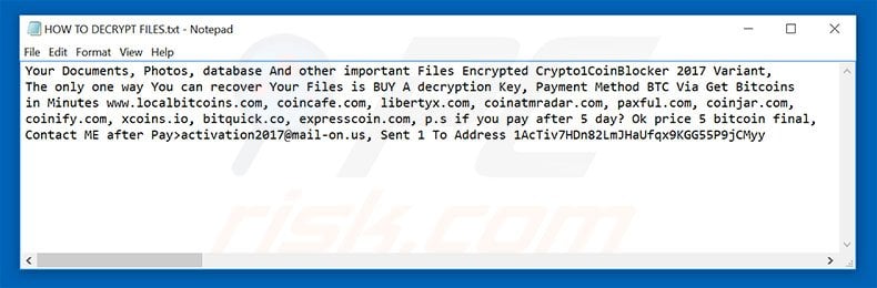 Your Documents, Photos, database And other important Files Encrypted Crypto1CoinBlocker 2017 Variant, The only one way You can recover Your Files is BUY A decryption Key, Payment Method BTC Via Get Bitcoins in Minutes www.localbitcoins.com, coincafe.com, libertyx.com, coinatmradar.com, paxful.com, coinjar.com, coinify.com, xcoins.io, bitquick.co, expresscoin.com, p.s if you pay after 5 day? Ok price 5 bitcoin final, Contact ME after Pay>activation2017@mail-on.us, Sent 1 To Address 1AcTiv7HDn82LmJHaUfqx9KGG55P9jCMyy