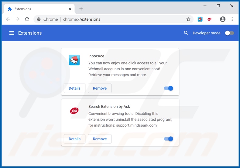 (at the top right corner of Google Chrome), select "More tools" and click "Extensions". Locate "InboxAce" and other recently-installed suspicious browser add-ons, and remove them.