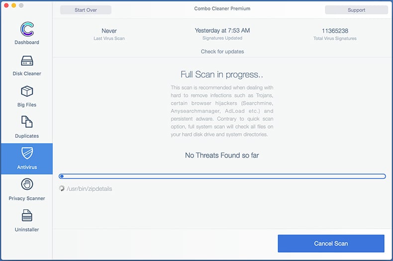 Combo Cleaner will scan your Mac for malware infections. If the antivirus scan displays "no threats found" - this means that you can continue with the removal guide; otherwise, it's recommended to remove any found infections before continuing.