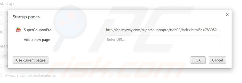 (at the top right corner of Google Chrome), select "Settings". In the "On startup" section, click "set pages", hover your mouse over SuperCouponPro and click the x symbol. Now, you can add your preferred website as your homepage.