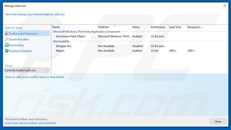 (at the top right corner of Internet Explorer), select "Manage Add-ons". Look for any recently-installed suspicious browser extensions, select these entries and click "Remove".