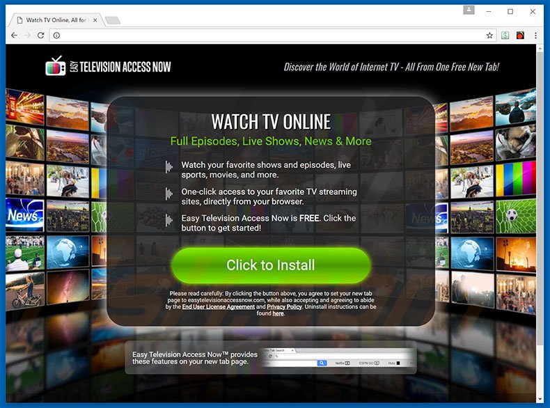 Easy Television Access Now is a deceptive application that falsely claims to allow users to watch TV via their web browsers. On initial inspection, Easy Television Access Now may appear legitimate and useful, however, this app is categorized as a potentially unwanted program (PUP) and a browser hijacker.
