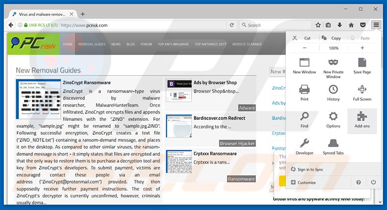 (at the top right corner of the main window), select "Add-ons". Click "Extensions", in the opened window, remove all recently-installed suspicious browser plug-ins.
