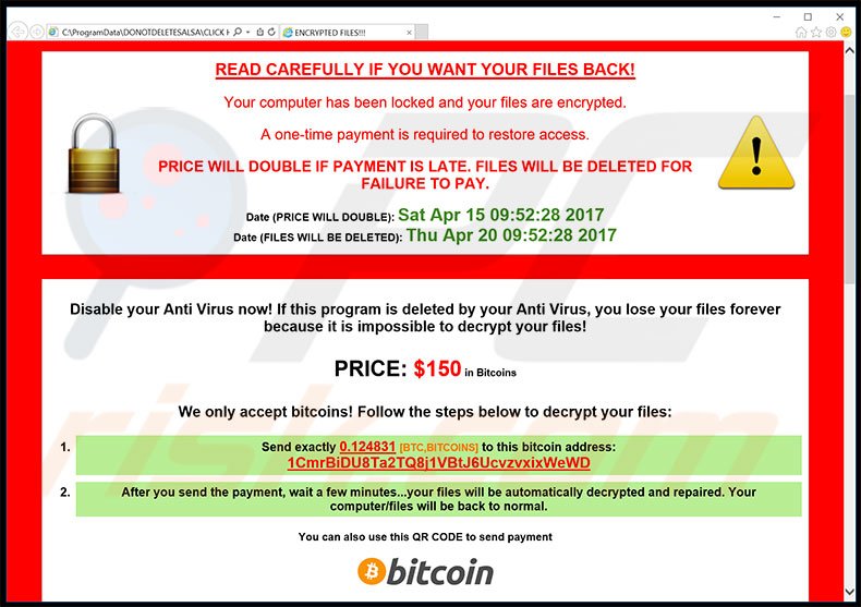 The message informs victims of the encryption and demands a ransom payment of the equivalent of $150 in Bitcoins. It is also stated that the ransom must be paid within five days, otherwise the cost will double. After a further five days, the files are permanently deleted. It is currently unknown whether Salsa uses symmetric or asymmetric cryptography.