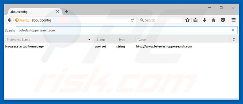 This browser hijacker changes the "Target" field of the Mozilla Firefox shortcut. To fix this, locate the shortcut on your Desktop and click the right mouse button over it. In the opened menu, choose "Properties". In the opened window, locate the Target field and eliminate all text (hxxp://www.beleelashoppersearch.com/...), which is entered after "C:\Program Files\Mozilla Firefox\firefox.exe"