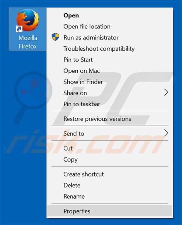 This browser hijacker changes the "Target" field of the Mozilla Firefox shortcut. To fix this, locate the shortcut on your Desktop and click the right mouse button over it. In the opened menu, choose "Properties". In the opened window, locate the Target field and replace whole text with browser's location (e.g., "C:\Program Files\Mozilla Firefox\firefox.exe").