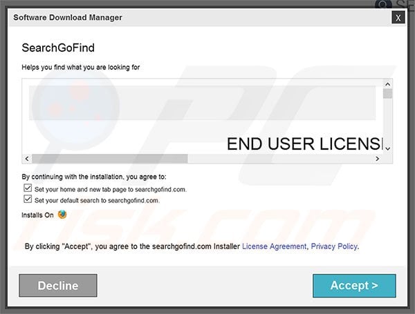 SearchGoFind is distributed using a deceptive marketing method called "bundling". Developers know that users often rush the download/installation processes and skip steps. Therefore, bundled applications are hidden within the "Custom/Advanced" settings of these processes. Skipping this section often leads to inadvertent installation of rogue apps such as SearchGoFind.