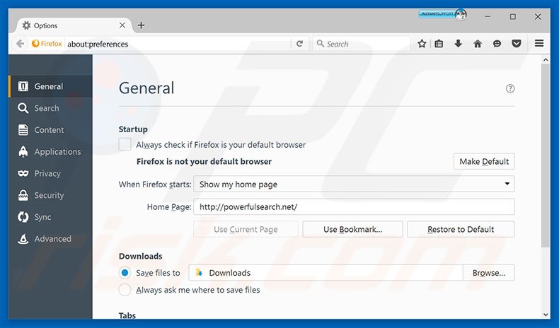 (at the top right corner of the main window) then select "Options", in the opened window, remove hxxp://www.powerfulsearch.net and enter your preferred domain, which will open each time you start Mozilla Firefox.