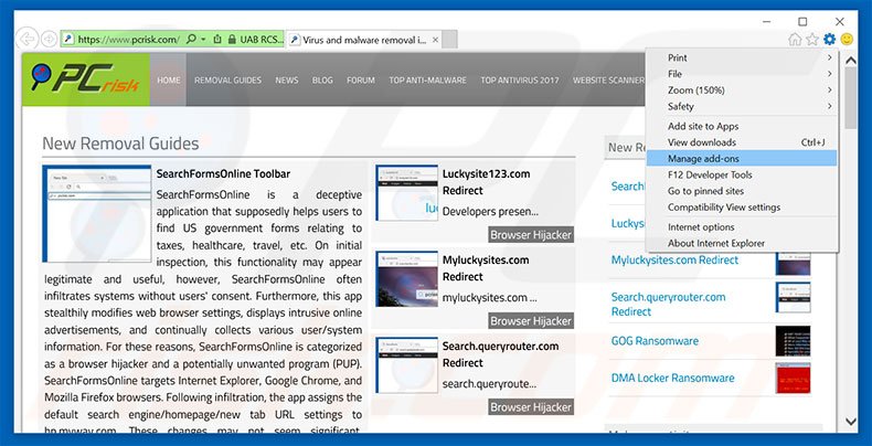 (at the top right corner of Internet Explorer), select "Manage Add-ons". Look for any recently-installed suspicious browser extensions, select these entries and click "Remove".