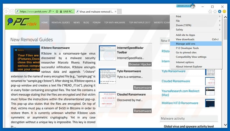 (at the top right corner of Internet Explorer), select "Manage Add-ons". Look for any recently-installed suspicious browser extensions, select these entries and click "Remove".