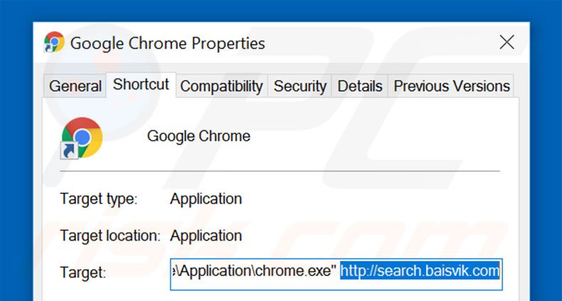 This browser hijacker modifies the "Target" field of the Google Chrome shortcut. To fix this, locate the shortcut on your Desktop and click the right mouse button over it. In the opened menu, choose "Properties". In the opened window, locate the Target field and eliminate all text (hxxp://www.search.baisvik.com/...), which is entered after "C:\Program Files\Google\Chrome\Application\chrome.exe"