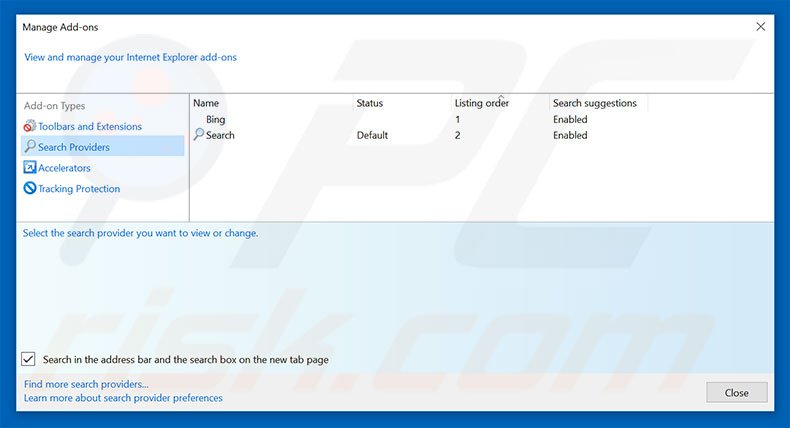(at the top right corner of Internet Explorer), select "Manage Add-ons". In the opened window, select "Search Providers", set "Google", "Bing" or any other preferred search engine as your default, then remove "loadstart".