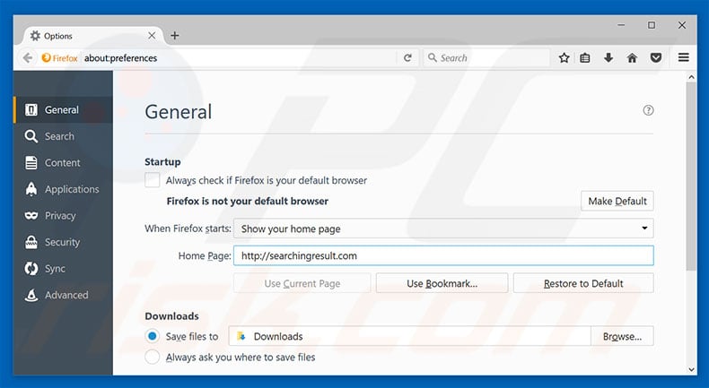 (at the top right corner of the main window) then select "Options", in the opened window, remove hxxp://www.searchingresult.com and enter your preferred domain, which will open each time you start Mozilla Firefox.
