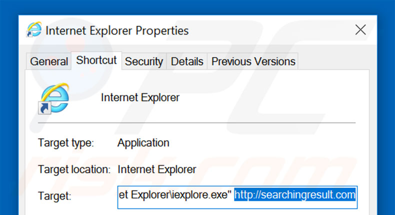 This browser hijacker changes the "Target" field of the Internet Explorer shortcut. To fix this, locate the shortcut on your Desktop and click the right mouse button over it. In the opened menu, choose "Properties". In the opened window, locate the Target field and eliminate text (hxxp://www.searchingresult.com/...), which is entered after "C:\Program Files\Internet Explorer\iexplore.exe".