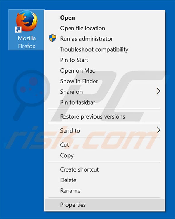 This browser hijacker changes the "Target" field of the Mozilla Firefox shortcut. To fix this, locate the shortcut on your Desktop and click the right mouse button over it. In the opened menu, choose "Properties". In the opened window, locate the Target field and eliminate all text (hxxp://www.strongpasswordsearch.com/...), which is entered after "C:\Program Files\Mozilla Firefox\firefox.exe"