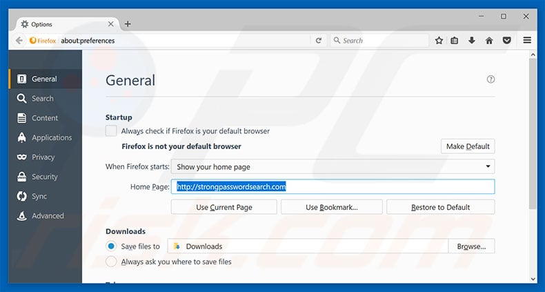 (at the top right corner of the main window) then select "Options", in the opened window, remove hxxp://www.strongpasswordsearch.com and enter your preferred domain, which will open each time you start Mozilla Firefox.