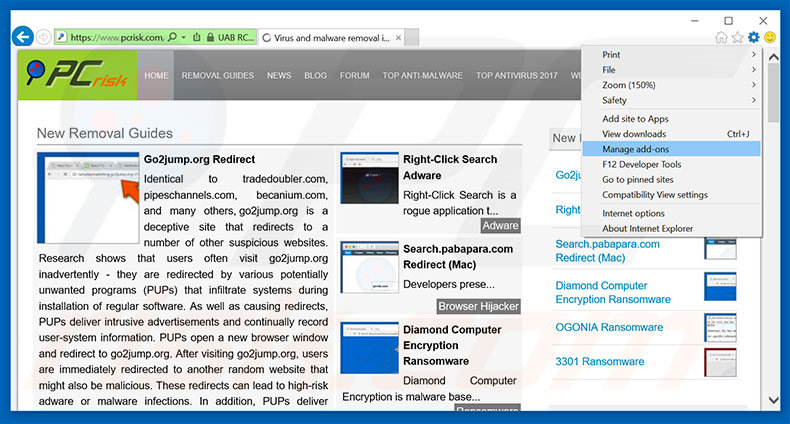 (at the top right corner of Internet Explorer), select "Manage Add-ons". Look for any recently-installed suspicious browser extensions, select these entries and click "Remove".