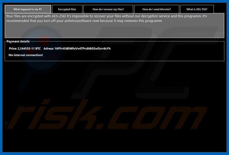 The fourth tab ("How do i send bitcoins?") supposedly explains how to submit payment, however, at time of research, it did not contain any relevant text. The last, fifth, tab ("What is AES 256?") provides detailed information regarding the encryption algorithm.
