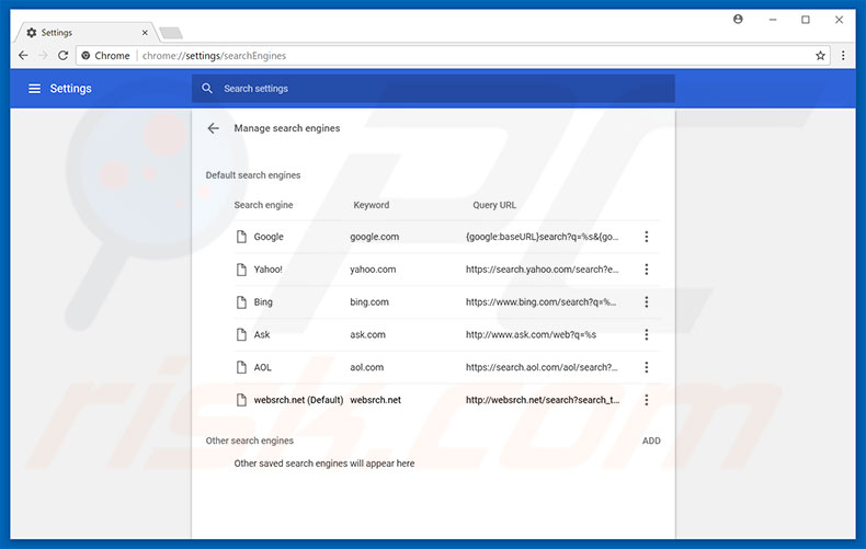 (at the top right corner of Google Chrome), select "Settings", in the "Search engine" section, click "Manage search engines...", in the opened list, look for "websrch.net", and when located, click the three vertical dots near this URL and select "Remove from list".