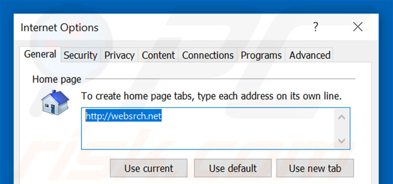 (at the top right corner of Internet Explorer), select "Internet Options", in the opened window, remove hxxp://www.websrch.net and enter your preferred domain, which will open each time you launch Internet Explorer.