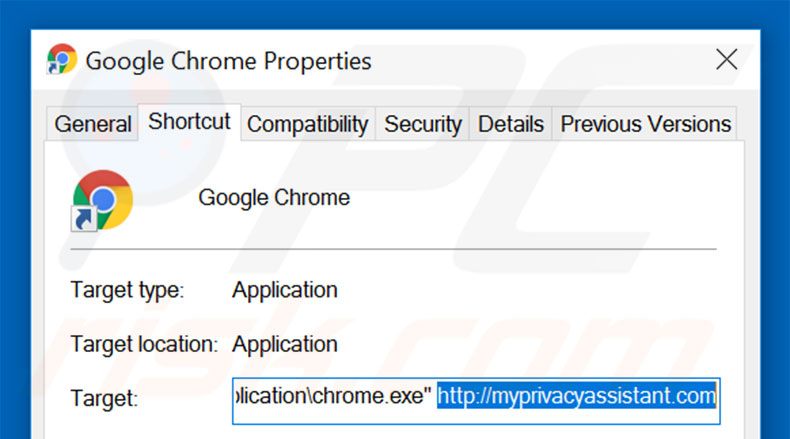 This browser hijacker modifies the "Target" field of the Google Chrome shortcut. To fix this, locate the shortcut on your Desktop and click the right mouse button over it. In the opened menu, choose "Properties". In the opened window, locate the Target field and eliminate all text (hxxp://www.myprivacyassistant.com/...), which is entered after "C:\Program Files\Google\Chrome\Application\chrome.exe"